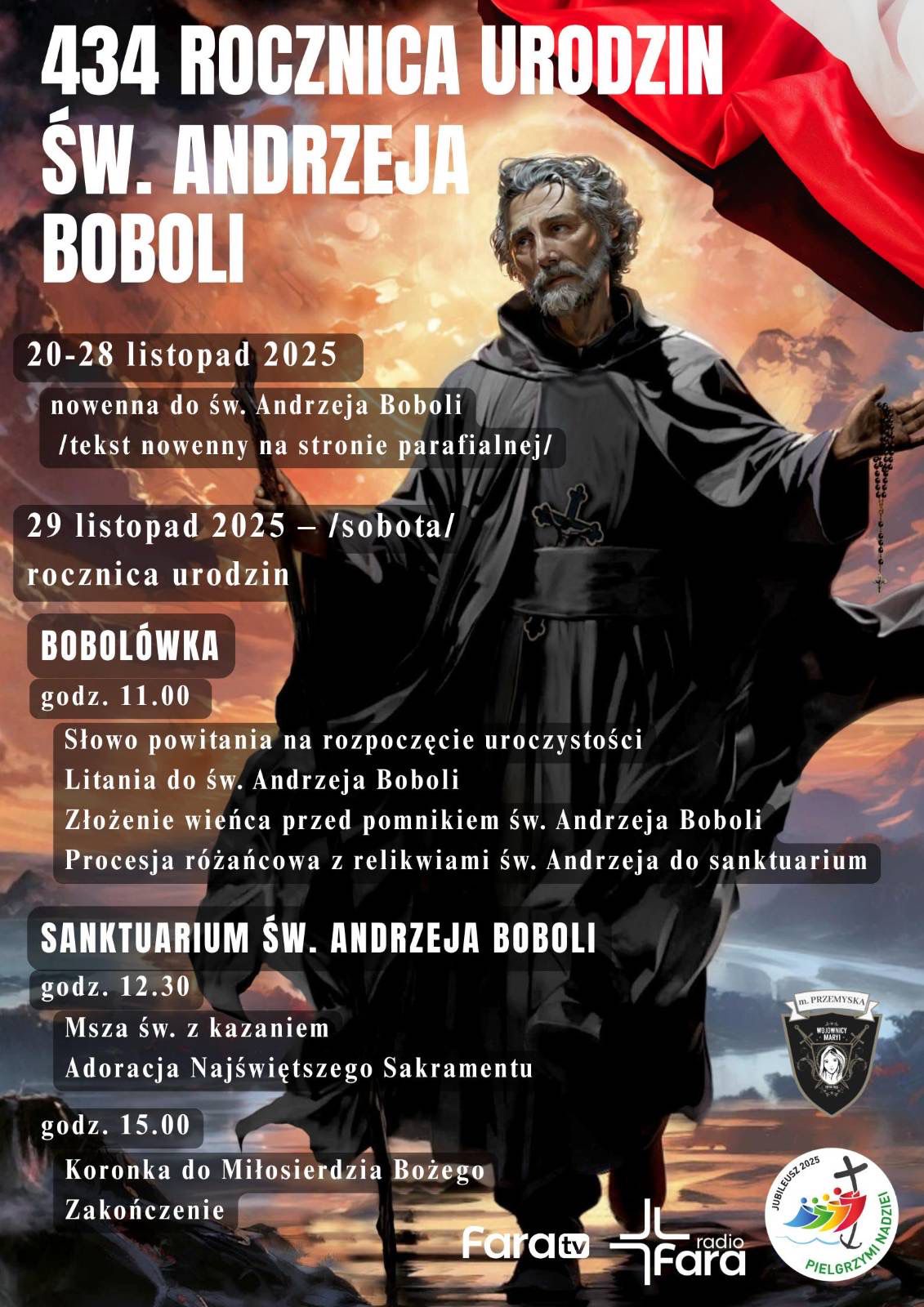 W sobotę 29 listopada 2025 o godzinie 11:00 na Bobolówce rozpoczęła się modlitwa za Polskę w 434 rocznicę urodzin Świętego Andrzeja Boboli. Modlitewnemu spotkaniu przewodniczył ksiądz prałat Józef Niżnik Kustosz Sanktuarium. Centralnym punktem była Eucharystia z okolicznościowym kazaniem a po niej adoracja Najświętszego Sakramentu. Informację dodano 2025-12-01 o godzinie 20:29:13